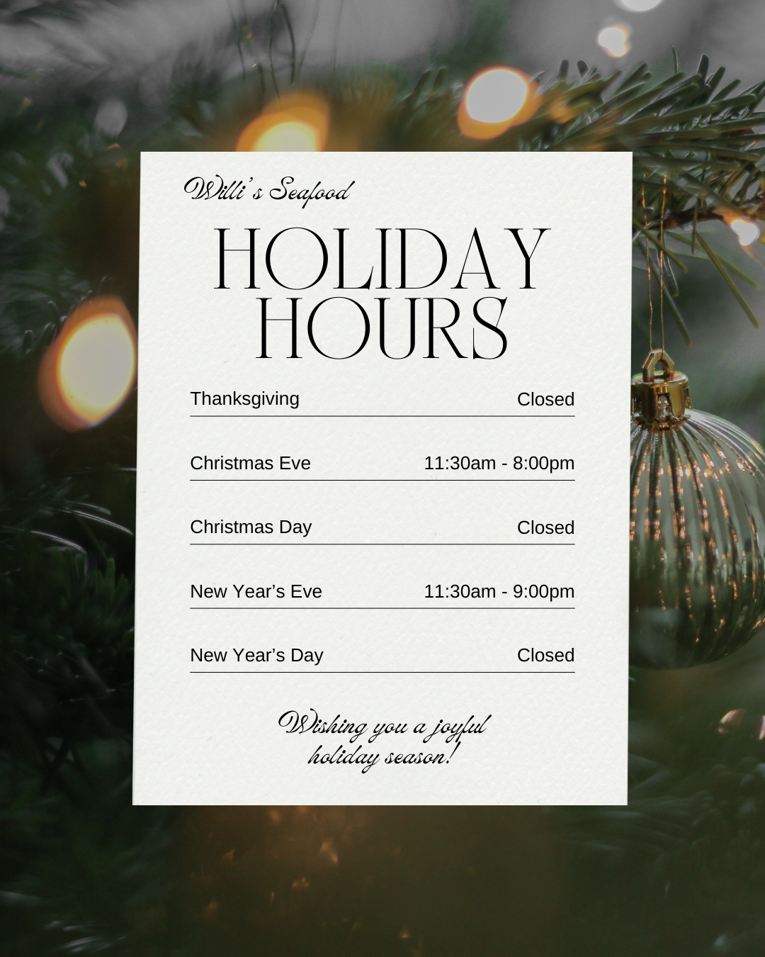 At Willi’s, every visit is a chance to savor the unexpected and feel at home in our vibrant, lively atmosphere. Join us for an unforgettable culinary journey that brings the best of the coast and beyond to your table.